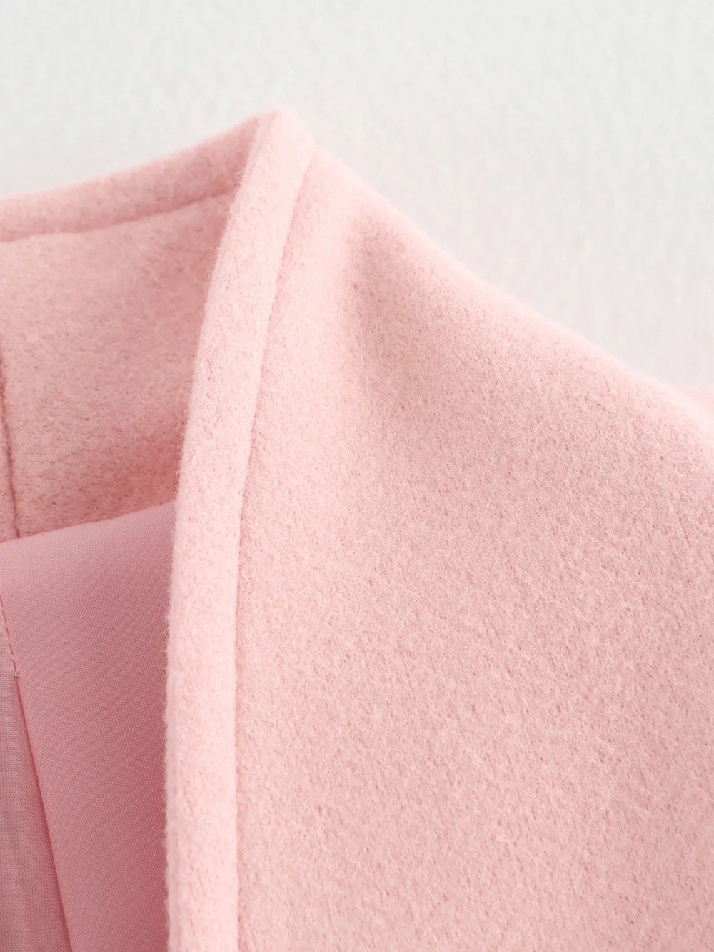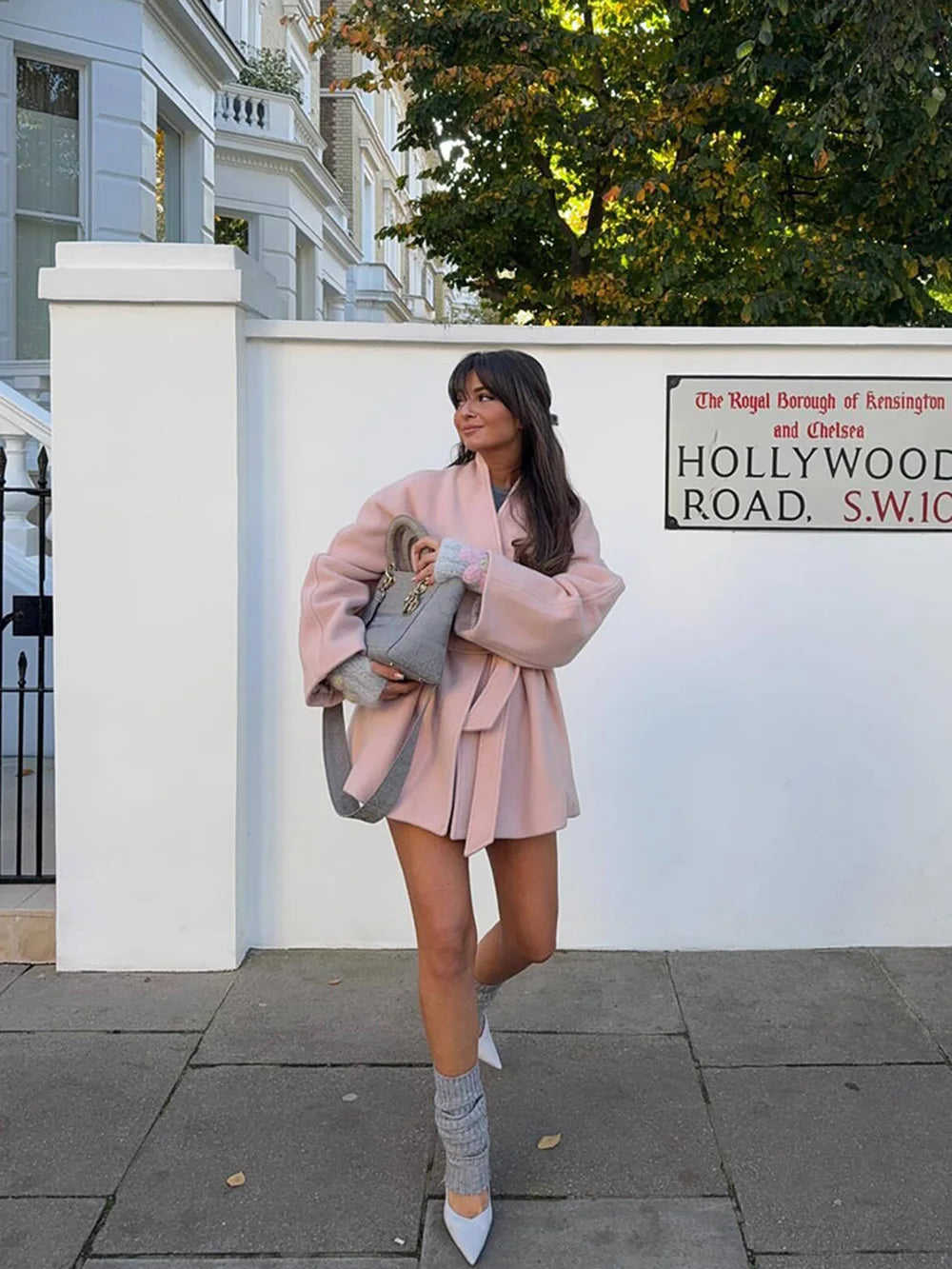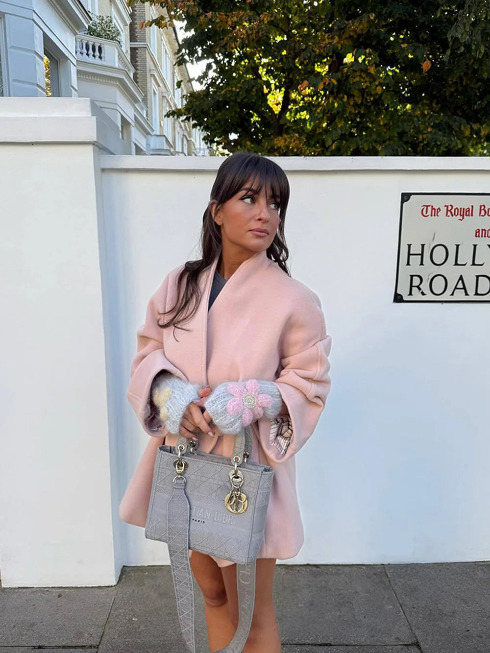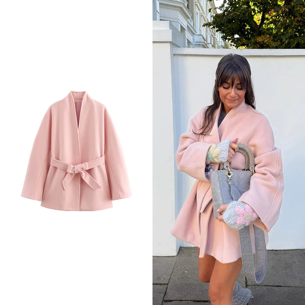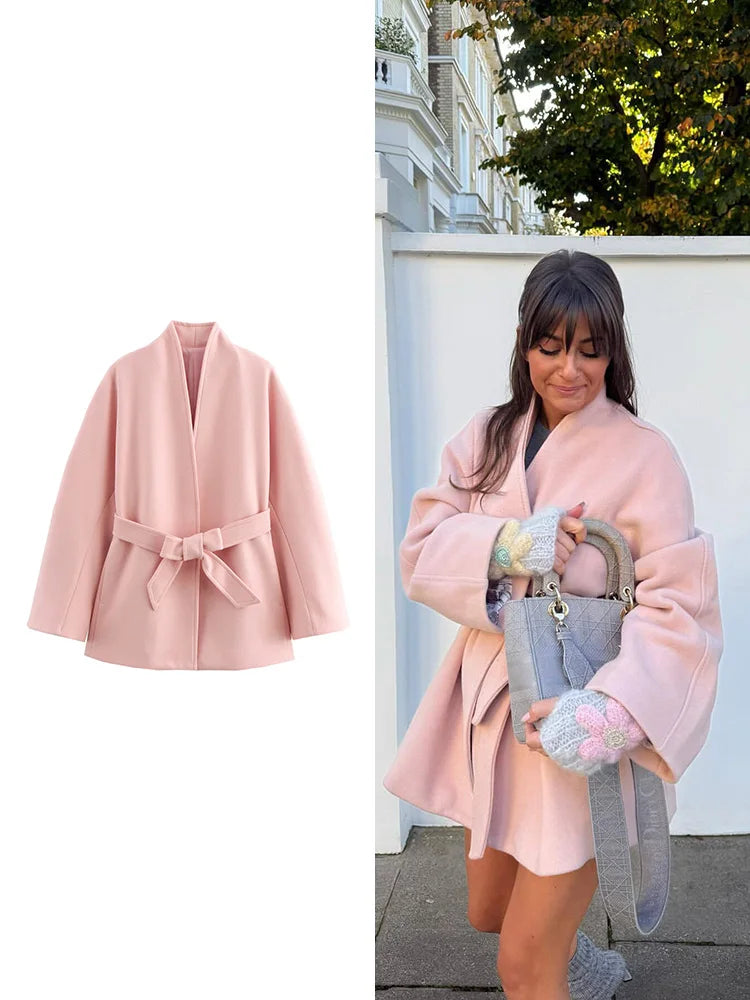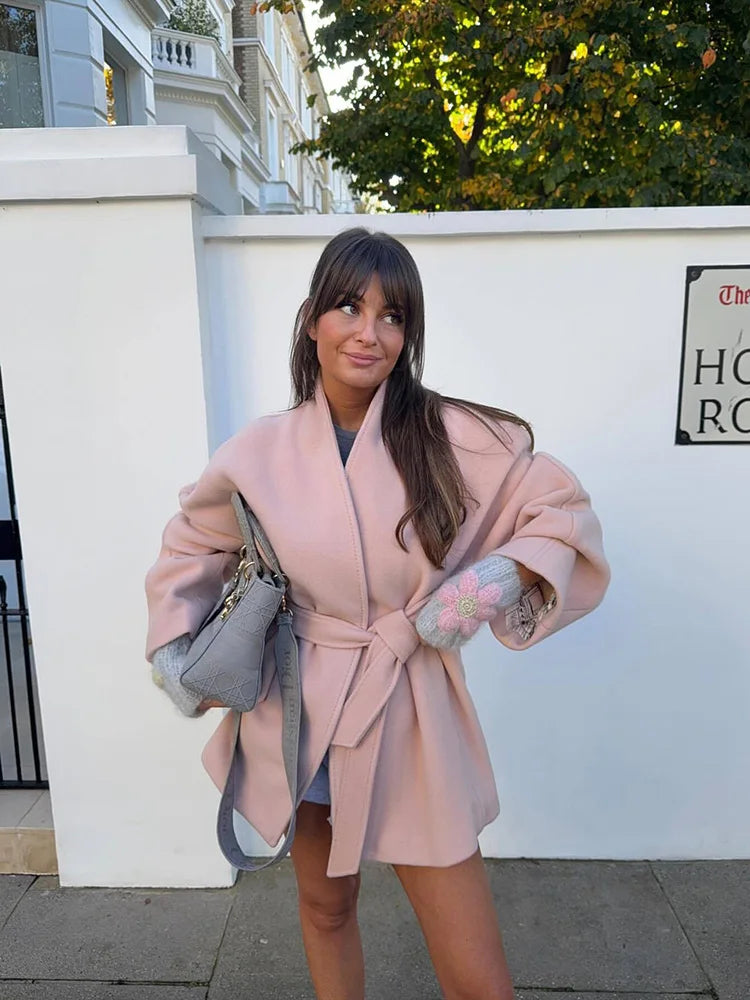 Dieser elegante Herbst-Winter-Mantel überzeugt durch eine klare, minimalistische Silhouette mit modernem V-Ausschnitt und einem luxuriösen Schleifen-Detail, das den Look auf ein neues Level hebt.