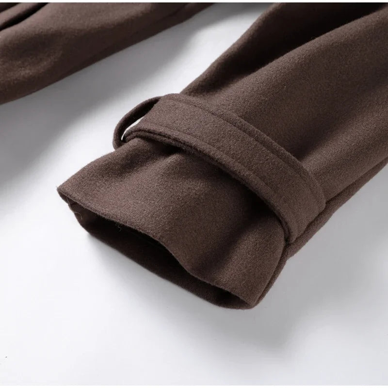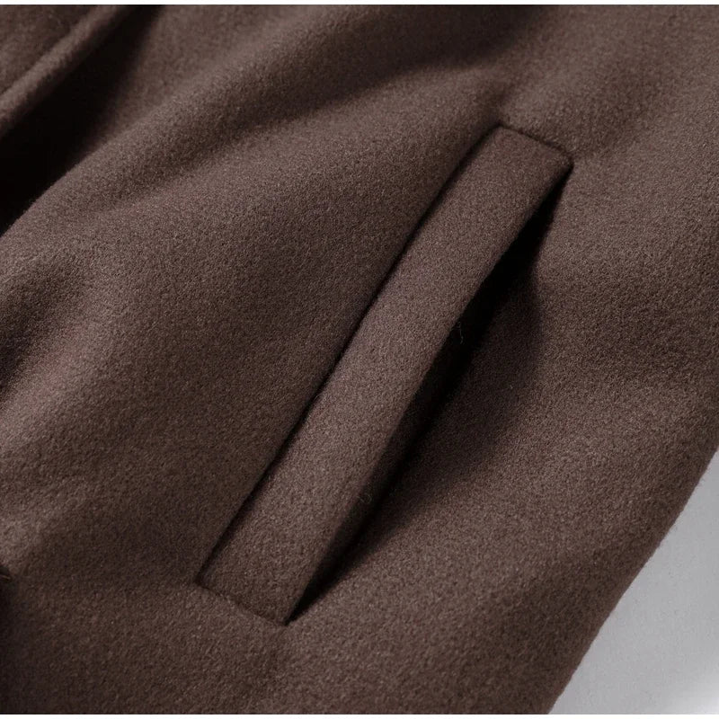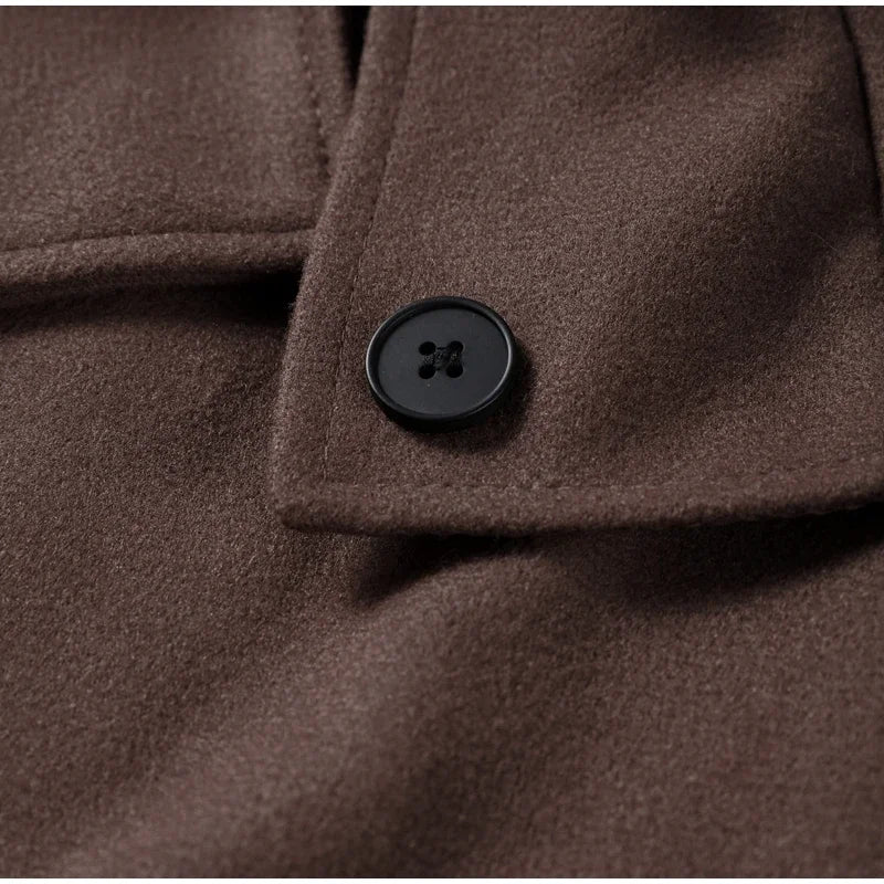 Die weiche Wolloptik verleiht Wärme und Komfort, während Taschen und goldene Knopfdetails den Look abrunden.