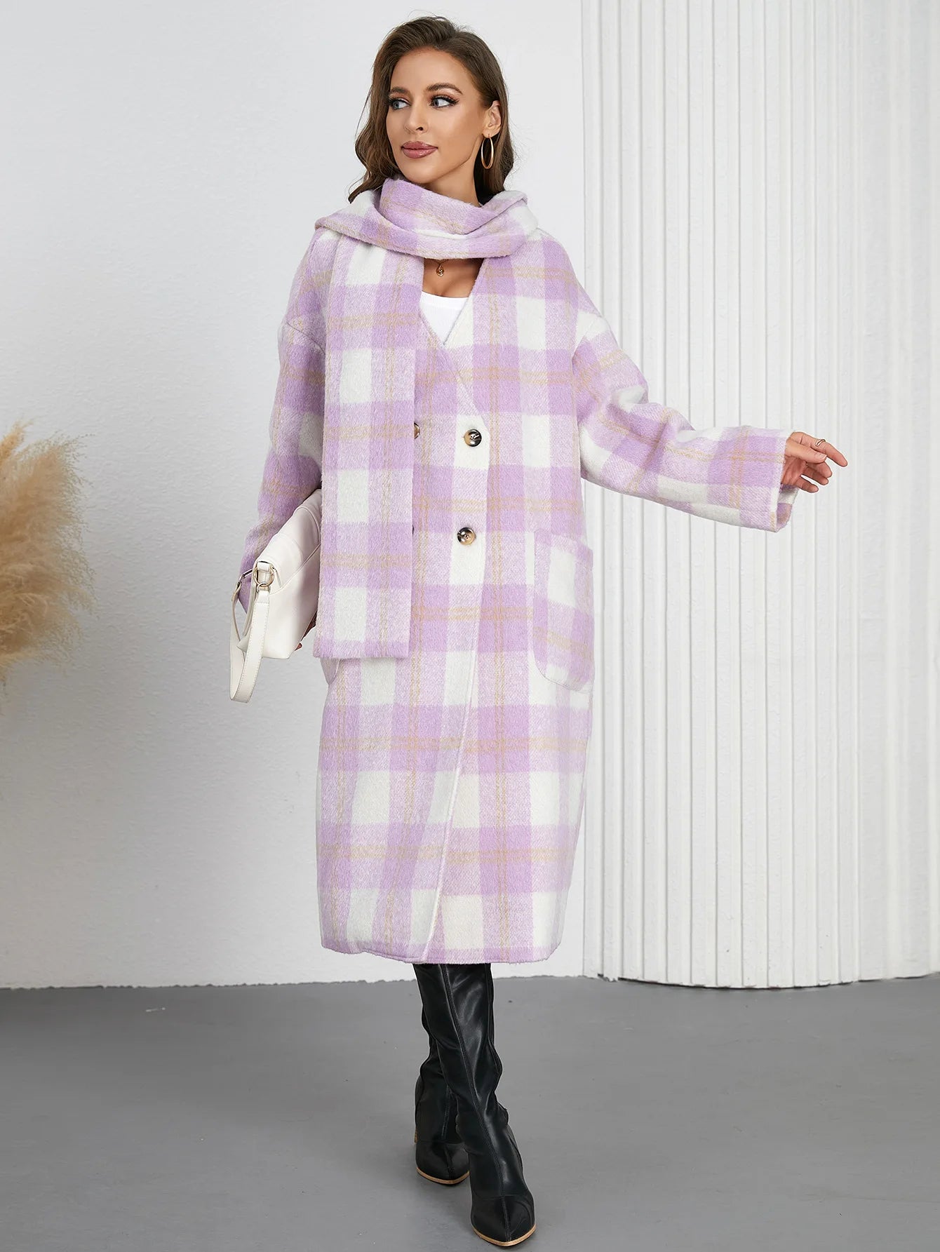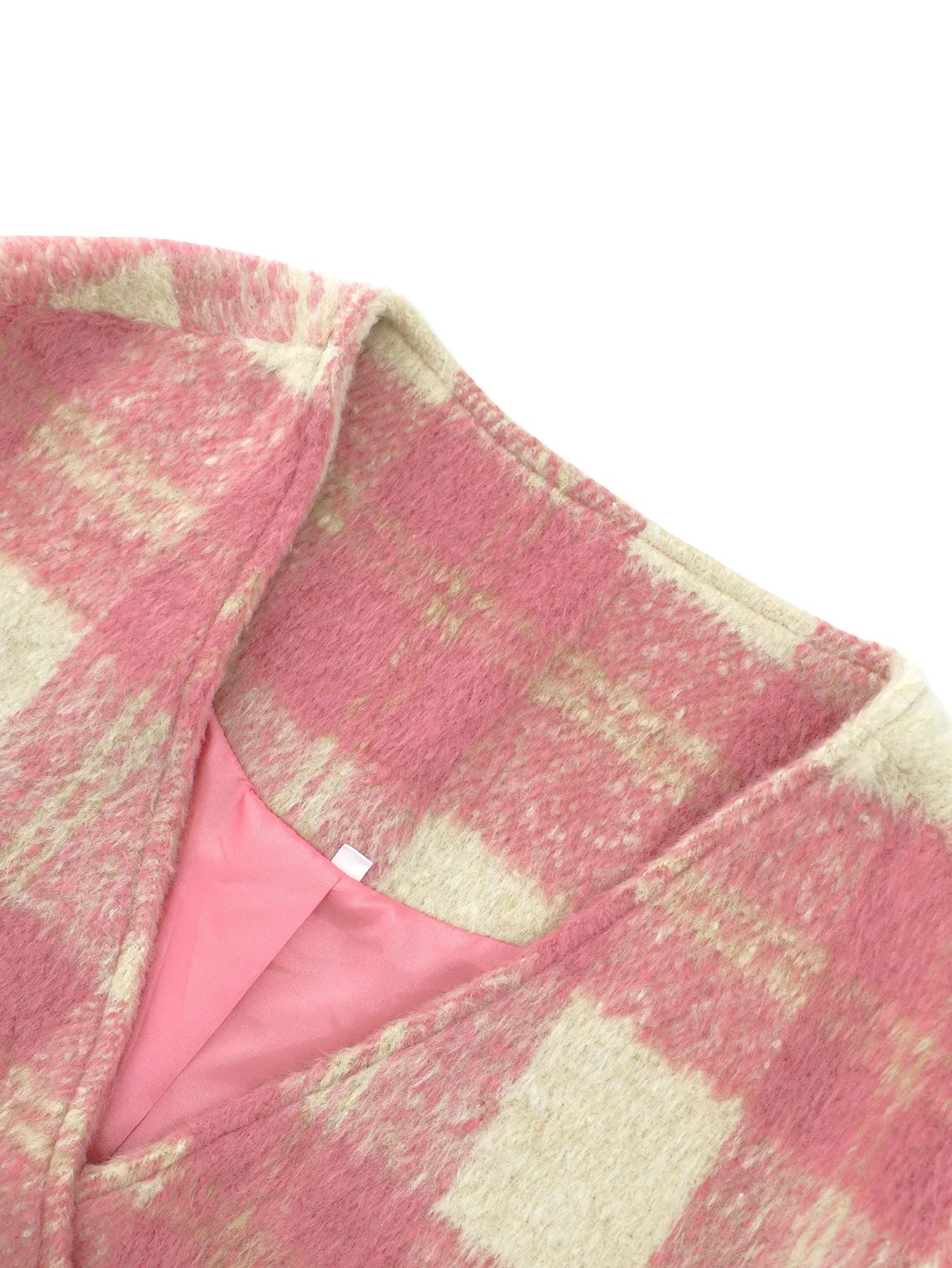 Ein stilvoller, mid-langer Damen-Wollmantel mit modernem Karomuster und eleganter, zweireihiger Vorderseite.