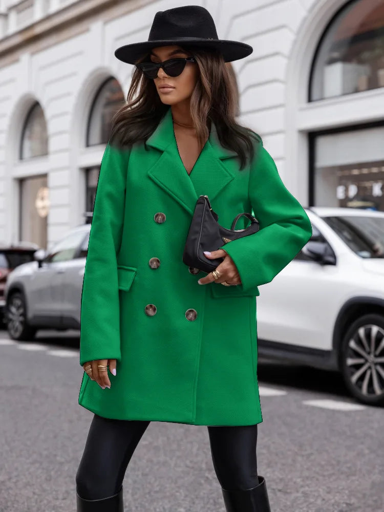 Der markante Blazerkragen verleiht Struktur und Eleganz, während der zweireihige Verschluss und das dezente Tweed-Material einen hochwertigen, zeitlosen Charakter schaffen.