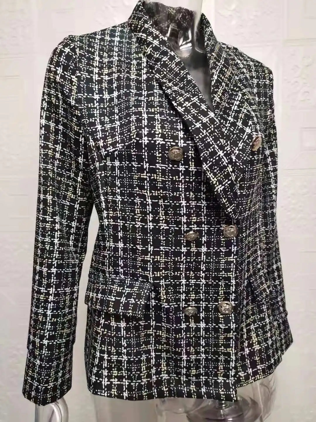 Ein eleganter Damenblazer im klassischen britischen Karomuster mit taillierter Passform und zweireihigem Design.