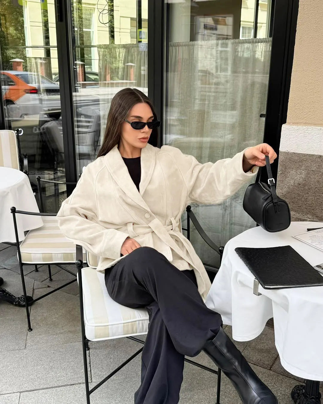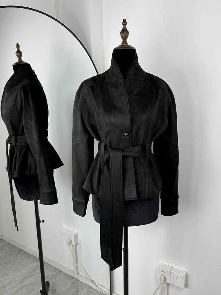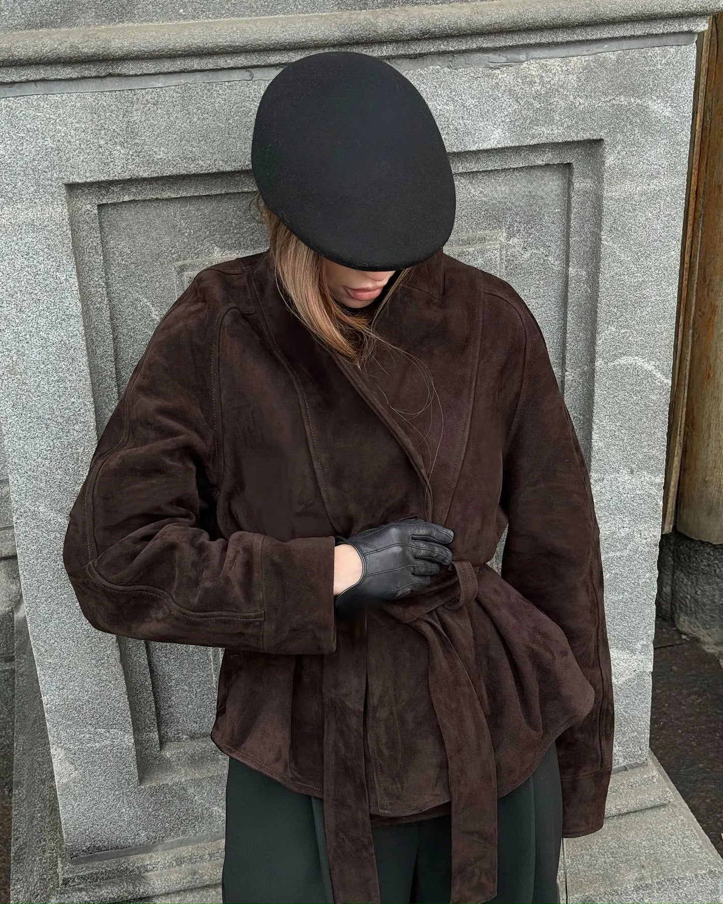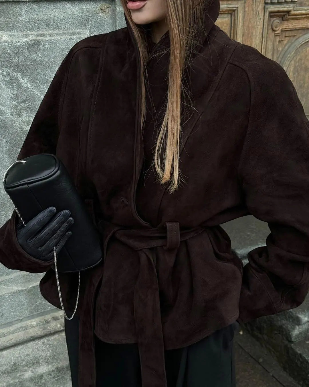 Eine moderne Wildlederjacke mit elegantem V-Ausschnitt und verstellbarer Taillenbindung, die eine schmeichelhafte, feminine Silhouette schafft.