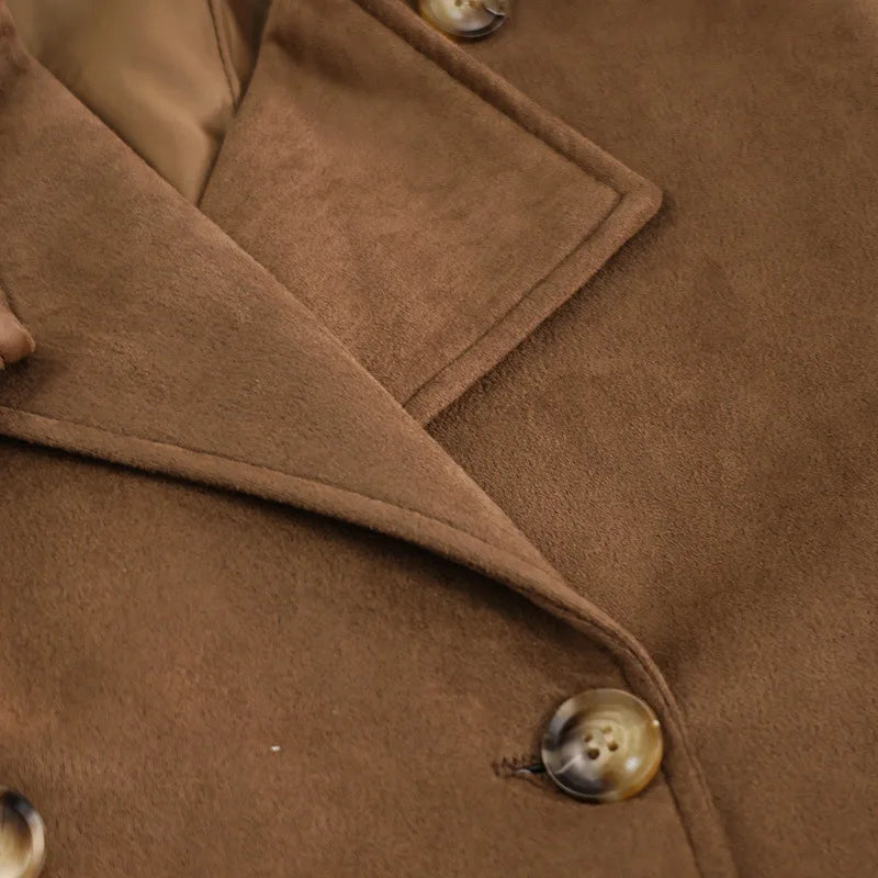 Die zweireihige Front und der Reverskragen verleihen Struktur und Präsenz, während der Gürtel die Taille formt und dem Look einen femininen Abschluss gibt.