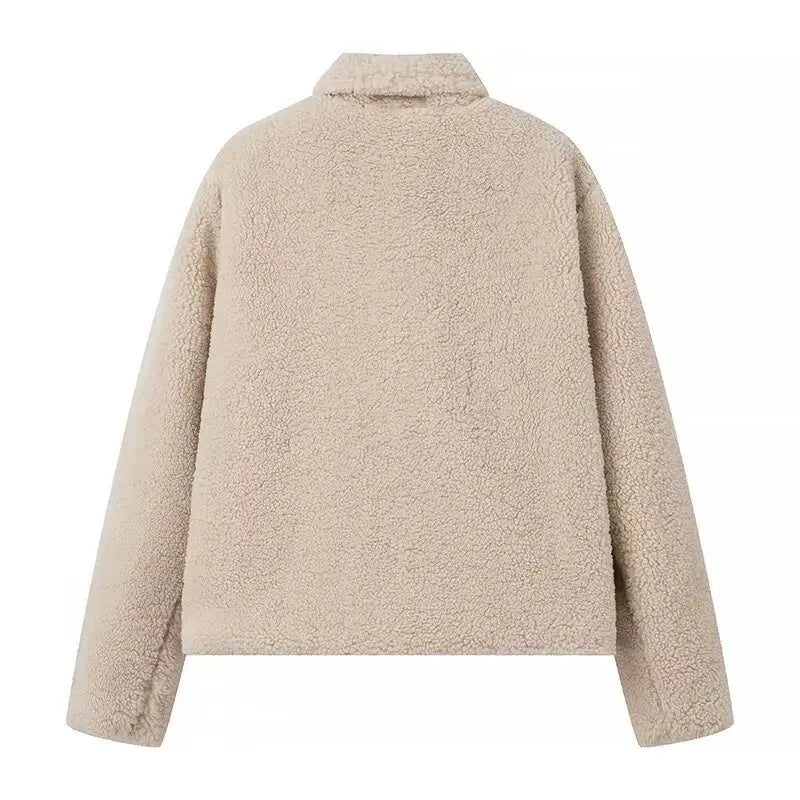 Ein warmer Damenmantel in weicher Lammwoll-Optik mit lockerem Schnitt und klassischem Umlegekragen – perfekt für kalte Herbst- und Wintertage.